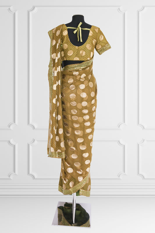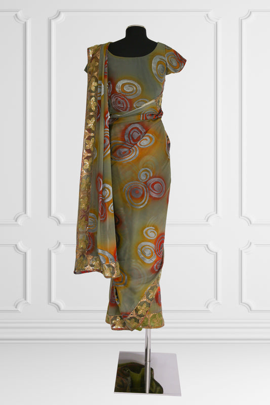 Olive Green Saree with Vibrant Swirls and Embroidered Gold Border