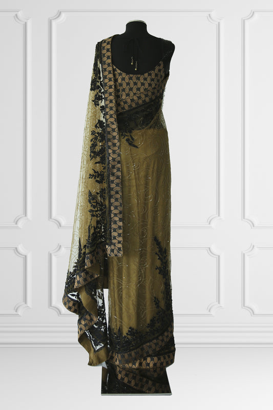 Two Blouse Black & Olive Tule Embroidered Saree Set