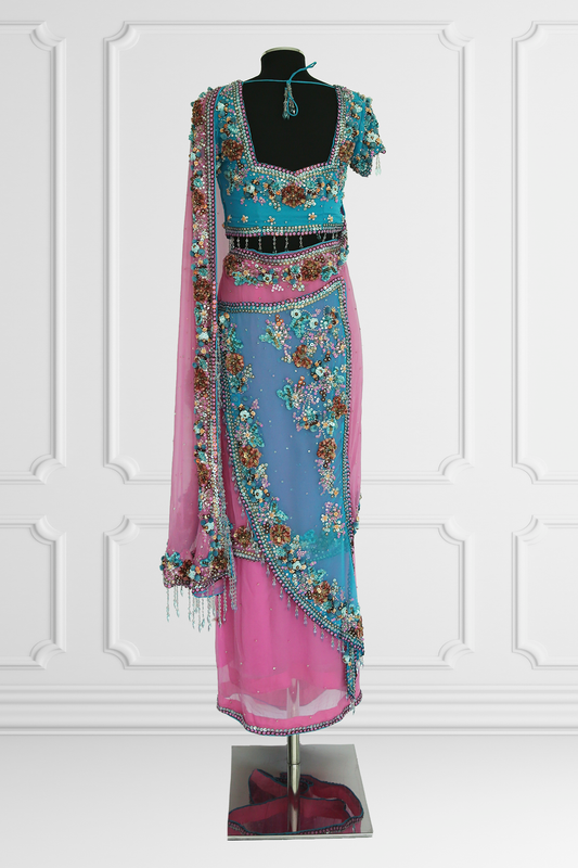 Two Blouse Pink & Blue Embroidered Saree Set
