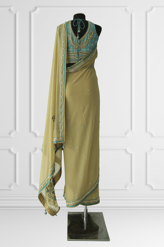 Two Blouse Nude & Turquoise Saree Set