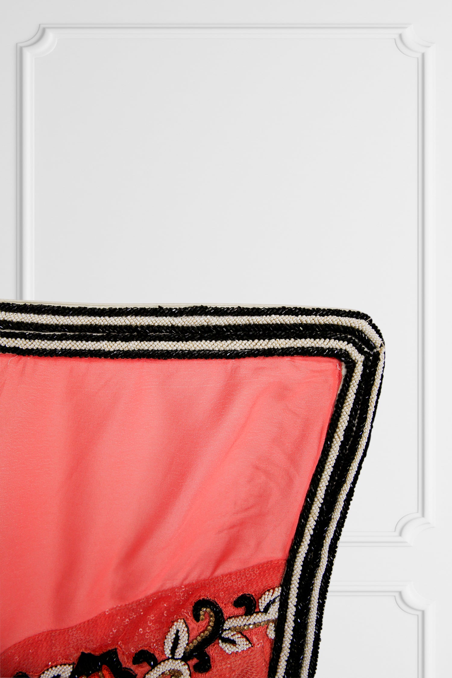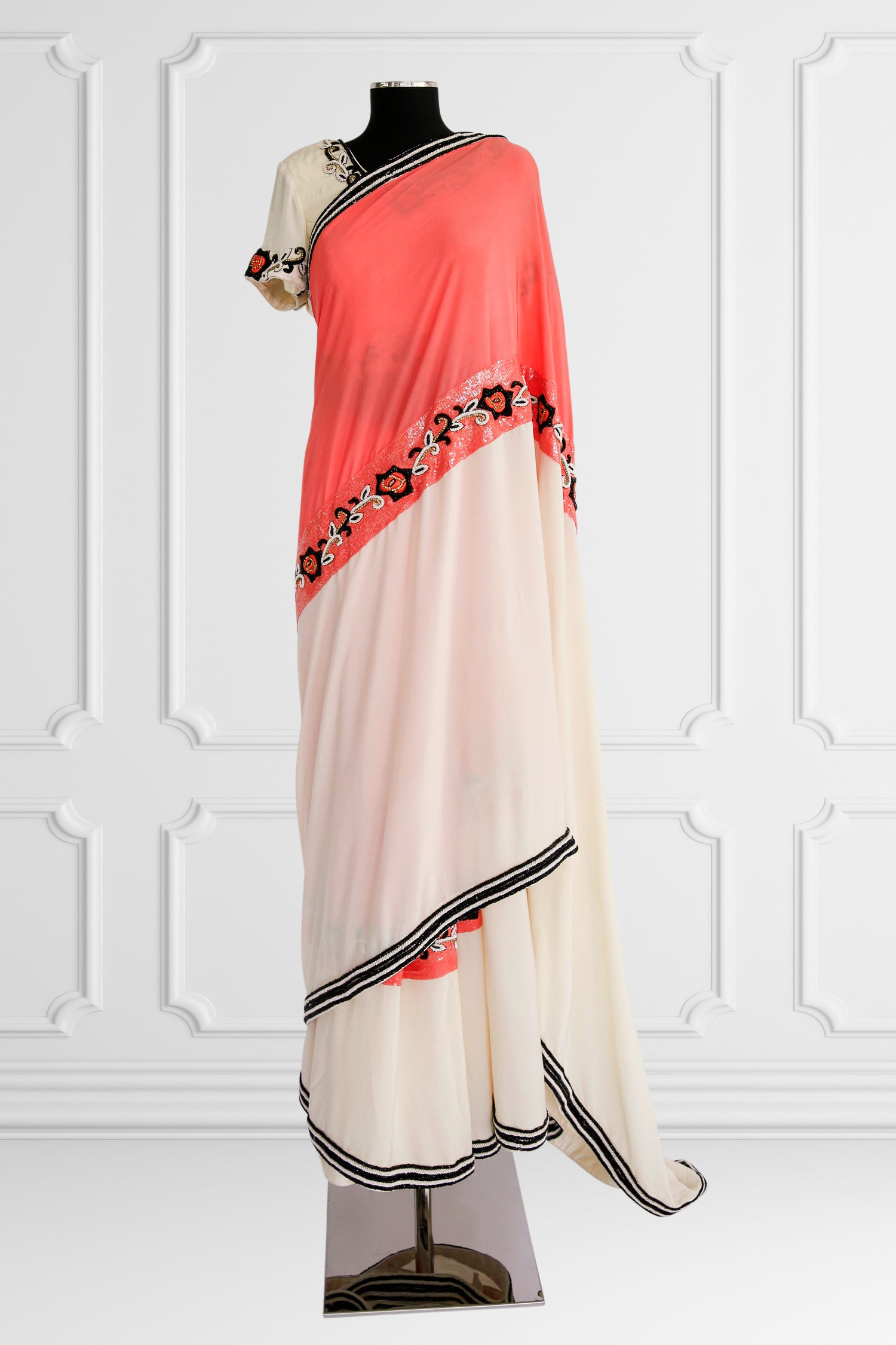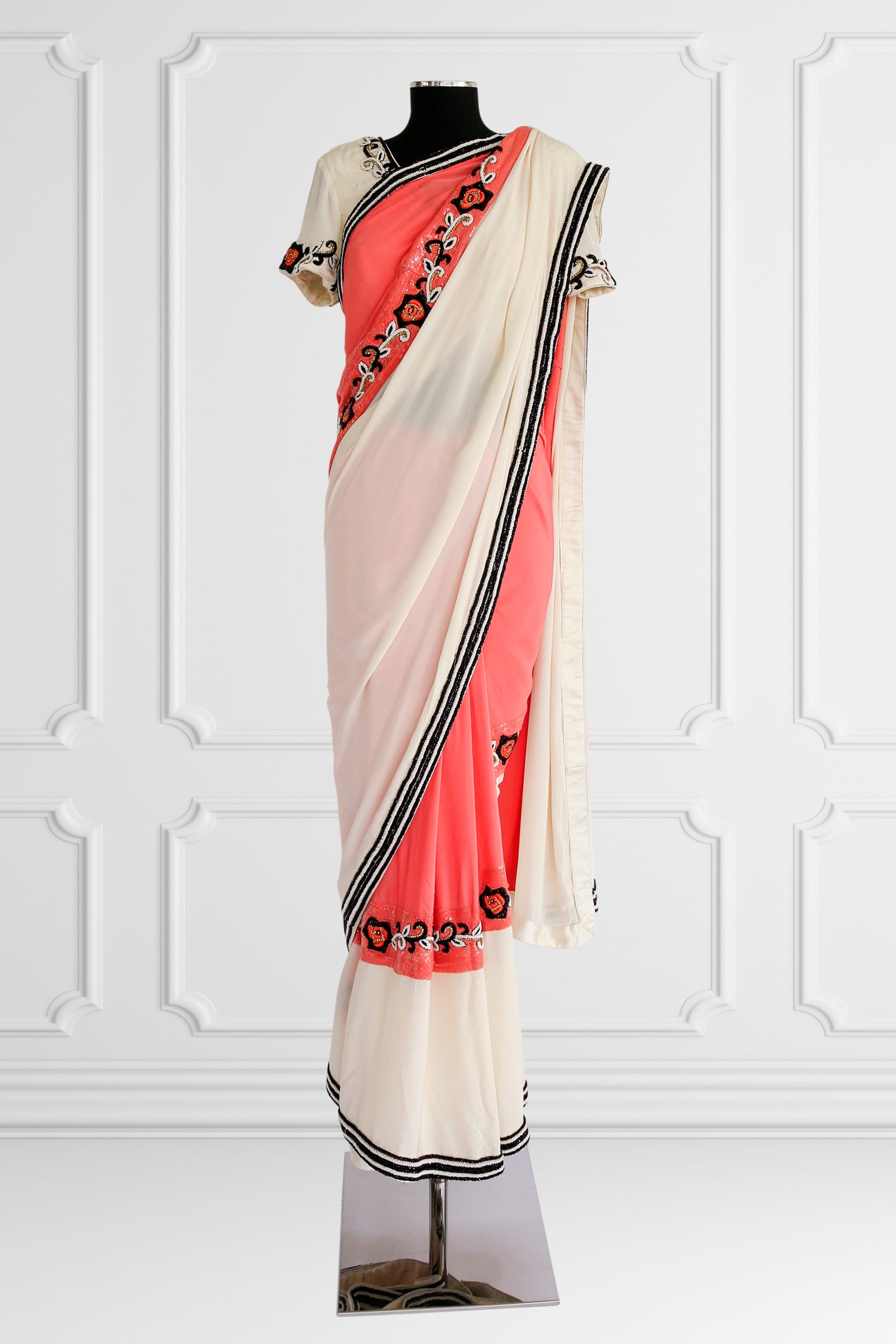 Expertly crafted with a two-tone design, this Bicolor Cream and Coral Saree Set features a beautiful coral and beige color palette. The floral embroidered border adorned with sequins and beads adds a touch of elegance, while the black and white sequins border adds a classic touch. The beige blouse features delicate embroidery on the neckline, back, and sleeves, adding a touch of elegance to your look. Elevate your ethnic wardrobe with this stunning saree set.