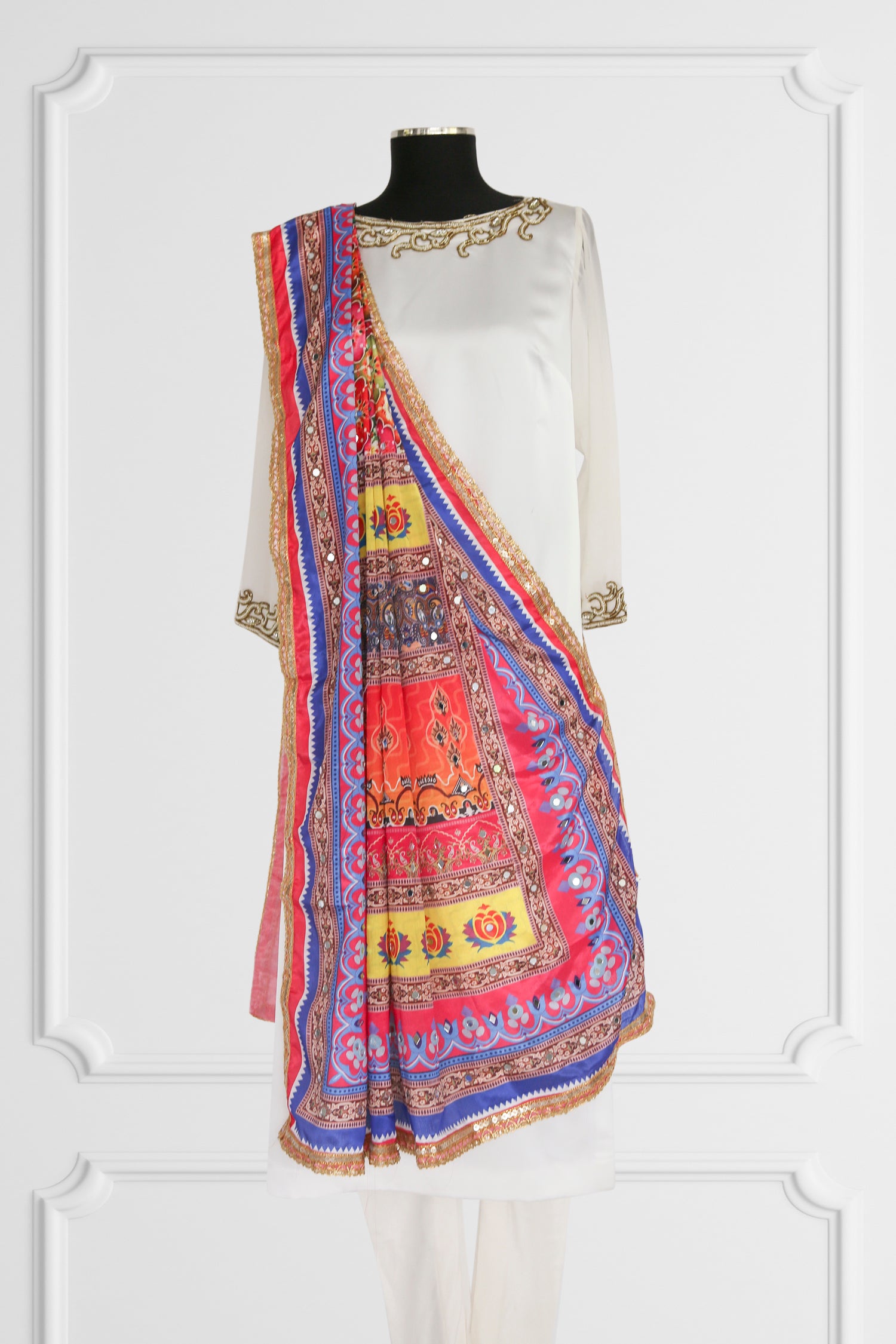 Add a pop of color to your wardrobe with our Printed Colorful Dupatta. With a beautiful and rich print, this accessory is the perfect addition to complete any look. Made with high-quality materials, our dupatta is a must-have for any wardrobe.
